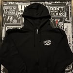 Maintain the Illusion of Choice print on back, TVHeadATX logo on front upper right. these hoodies are super thick and heavy duty. Independent Trading Company brand black zip-up hoodies. Eco friendly water based inks used on all my apparel.