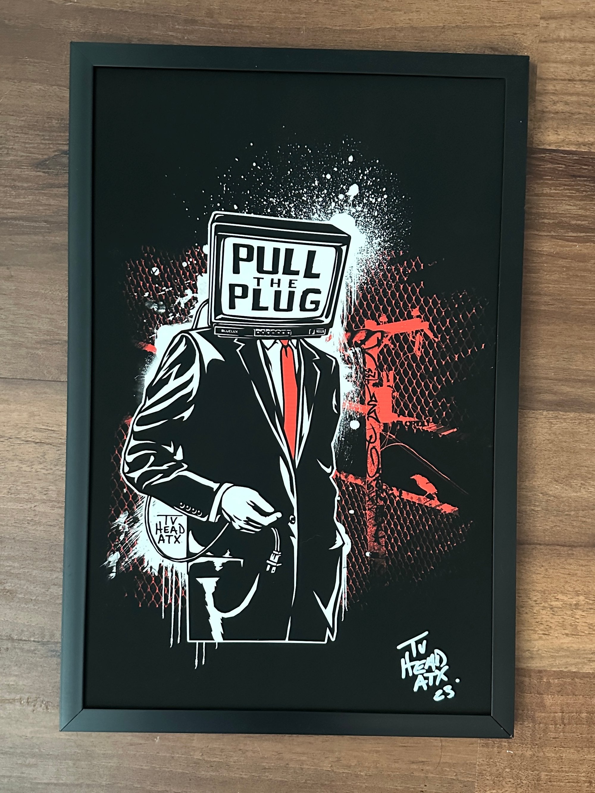 The message is clear: Pull the Plug. 11'' x 17'' and locally printed. Signed by TVHeadATX, and shipped in a frame to save you the hassle of making decisions. Let this art hang in your home, and let go of the illusion of control.